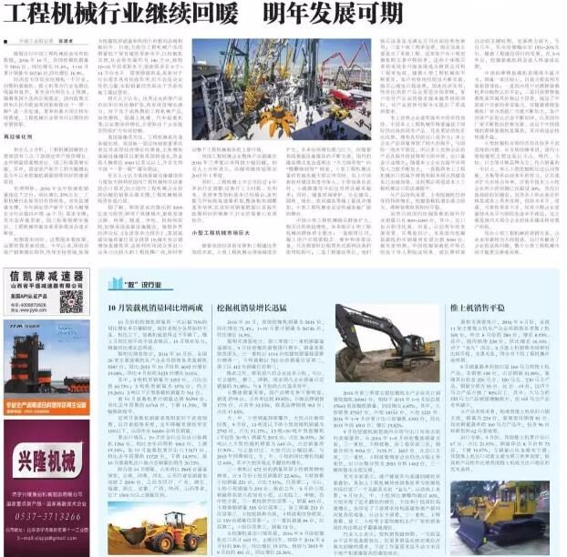 我國工程機械企業整體產品銷量在2016年三季度以來得到大幅回暖,相關人士分析表示,回暖將繼續延續至2017年1季度。