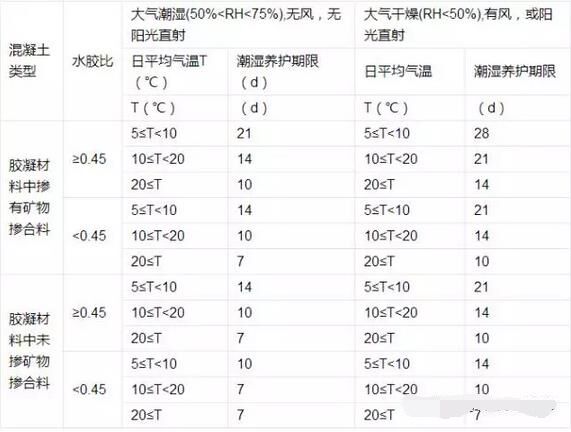 養護持續時間不夠是施工中的一個常見問題,常常是在澆筑的剛開始幾天內有人養護,最后就流于形式,應付了事,甚至無人養護。混凝土結構工程施工規范規定采用硅酸鹽水泥、普通硅酸鹽水泥或礦渣硅酸鹽水泥配制的混凝土,不應少于 7d,采用緩凝型外加劑、大摻量礦物摻合料配制的混凝土及抗滲混凝土、強度等級 C60 及以上的混凝土和后澆帶混凝土的養護時間不應少于 14d;地下室底層和上部結構首層柱、墻混凝土帶模養護時間,不宜少于 3d; 帶模養護結束后可采用灑水養護方式繼續養護。