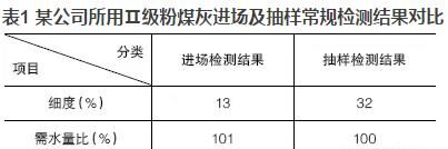 優質的粉煤灰摻入混凝土可明顯地改善混凝土的和易性,當粉煤灰摻量大于膠材總量的5%~10%時,效果極為明顯。現今在混凝土實際生產中,粉煤灰摻量往往達到20%,有的甚至高達30%,但混凝土的和易性卻不盡人意。抽取原材料進行檢測時,發現粉煤灰的檢測結果經常不滿足標準要求或者與驗收時的結果相差甚遠。現以某公司所用Ⅱ級粉煤灰進場及抽樣常規檢測結果進行對比,見表1。