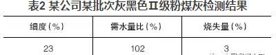 混凝土公司大多數使用的粉煤灰顏色與水泥相近,多呈灰色;也有部分粉煤灰顏色較深呈灰黑色,這種粉煤灰一般細度較細或含碳量較高。但總會發現一些深顏色的粉煤灰檢測結果與常理不符,如某公司某批次灰黑色Ⅱ級粉煤灰檢測結果見表2。