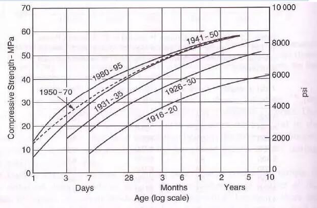 混凝土的大頭就是水泥。水泥是影響混凝土質量的最重要因素之一。28d齡期以后強度不增長,早期水化熱高,早期開裂顯著等問題,這都是當前混凝土生產用水泥存在一些常人難以理解的。盡管混凝土質量控制影響因素較多,但20世紀20年代以來,從水泥工業的發展背景來看,盡管水泥外貌并沒有顯著變化,但是水泥的礦物組份和強度等性能隨著水泥工業的現代化進程而發生了巨大變化,這些變化均對于今天的混凝土質量控制產生了重要影響。A. M. Neville 在《Properties ofconcrete》(Fourth Edition)一書中指出水泥變化可概括如下四點: