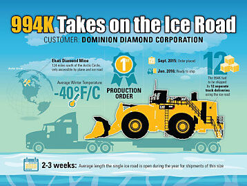 一旦機器安全到達客戶的施工現場,真正的樂趣就開始了。Carlos與卡特彼勒代理商芬寧加拿大分部的四名機械師合作安裝了這臺長18米的設備。Carlos非常喜歡客戶定期來到994K的安裝現場,客戶對在施工現場使用這種新型Cat裝載機的興奮勁也讓他很開心。“看到這么大的設備Dominion Diamond很興奮,他們迫不及待地希望把它派上用場。”