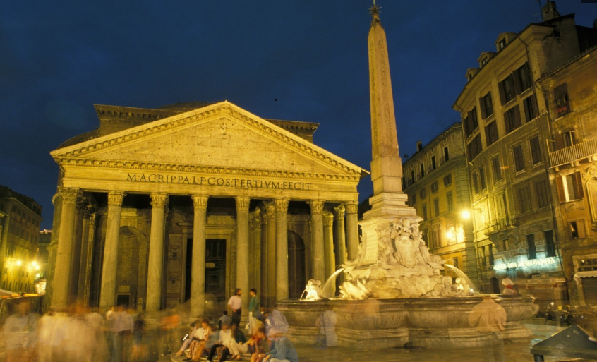 在羅馬市中心,有一個中央豎立著高大的尖頂方碑的噴水池,方碑基座雕有古羅馬神話場景,這一噴水池所在地就是羅馬萬神殿的前庭。它是至今完整保存的唯一一座羅馬帝國時期建筑