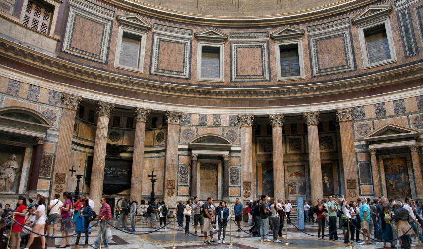 此廟始建于公元前27年,后遭毀,約公元118年在哈德良皇帝時期重建。 由水泥澆鑄成圓形,上覆半球形穹隆頂,直徑43米。萬神廟采用了穹頂覆蓋的集中式形制,重建后的萬神廟是單一空間、集中式構圖的建筑物的代表,它也是羅馬穹頂技術的最高代表。