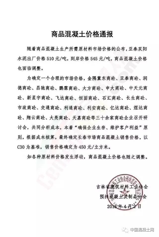 為確定一個合理的市場價格,金隅冀東商砼、亞泰商砼、潤德商砼、昌馳商砼、鵬霖商砼、大方商砼、中天元商砼、新星宇商砼、飛達商砼、石匯商砼、長生商砼、市政商砼、交通商砼、利通商砼、利安商砼、億達商砼、煜達商砼、翔云商砼、大亮商砼、天嘉商砼等三十余家商砼企業召開研討會,共同分析,本著“確保企業生存、維護客戶利益”原則,根據成本核算,最終確定長春市場商品混凝土銷售價格,以C30為基準,銷售價格確定為450元/立方米。