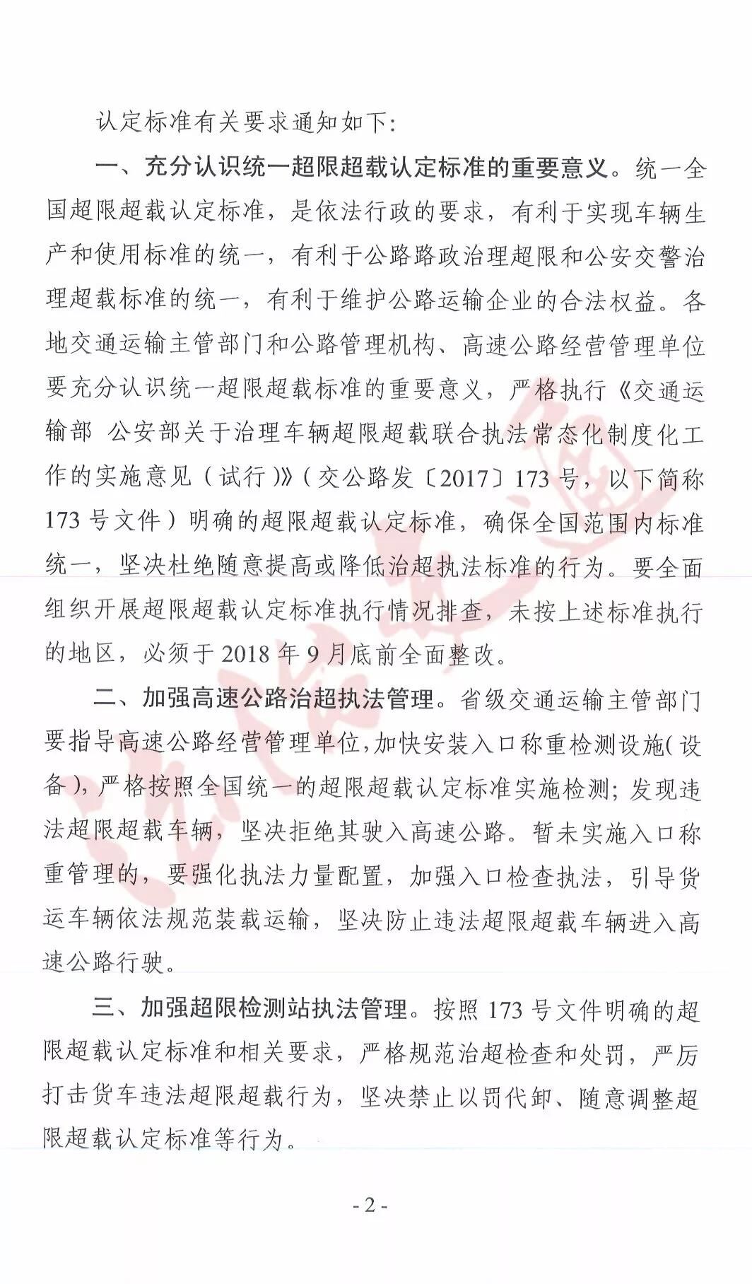 文件強(qiáng)調(diào):部分地區(qū)依然未嚴(yán)格執(zhí)行全國統(tǒng)一超限超載認(rèn)定標(biāo)準(zhǔn),部分高速公路對超限30%的車輛仍然按照基本費率計重收費,導(dǎo)致高速公路與普通公路治超標(biāo)準(zhǔn)不一致,不同省份執(zhí)法力度不統(tǒng)一等問題。未按標(biāo)準(zhǔn)執(zhí)行的地區(qū),9月底前全面整改。