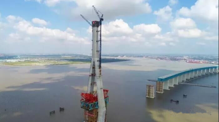在國內,大部分橋梁主塔高度都在260米以下,300米以上極其少見,而本次完成施工的大橋北側主塔,建設整體高達330米,相當于110層高樓,為國內最高主塔,同時也是世界公鐵兩用斜拉橋中最高主塔;混凝土澆筑達7.3萬方,鋼筋1.1萬噸,體量也為世界最大。