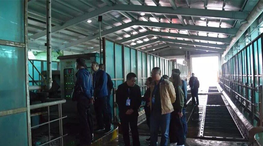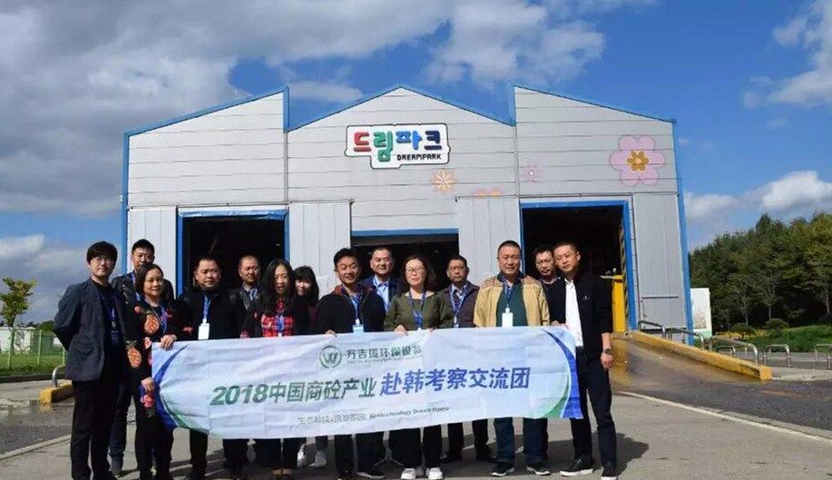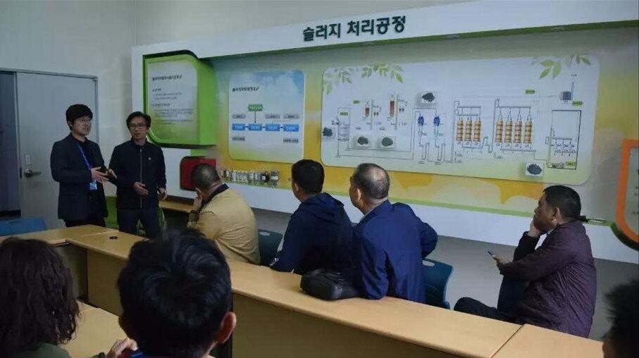 10日下午考察團一行到達韓國最大的垃圾填埋廠,首先參觀生活食品垃圾運輸車輛沖洗設備,此套設備由兩組車輛沖洗線構成,每條線長度為50米,當車輛駛入至感應區設備自動啟動對車輛全方位立體式沖洗,沖洗中掉落的異物經特制排泥裝置送至中央皮帶輸送機。車輛完成沖洗后駛出前對車身噴淋消毒去異味藥劑,最后烘干后離開。每日完成一千車次的清洗消毒工作。