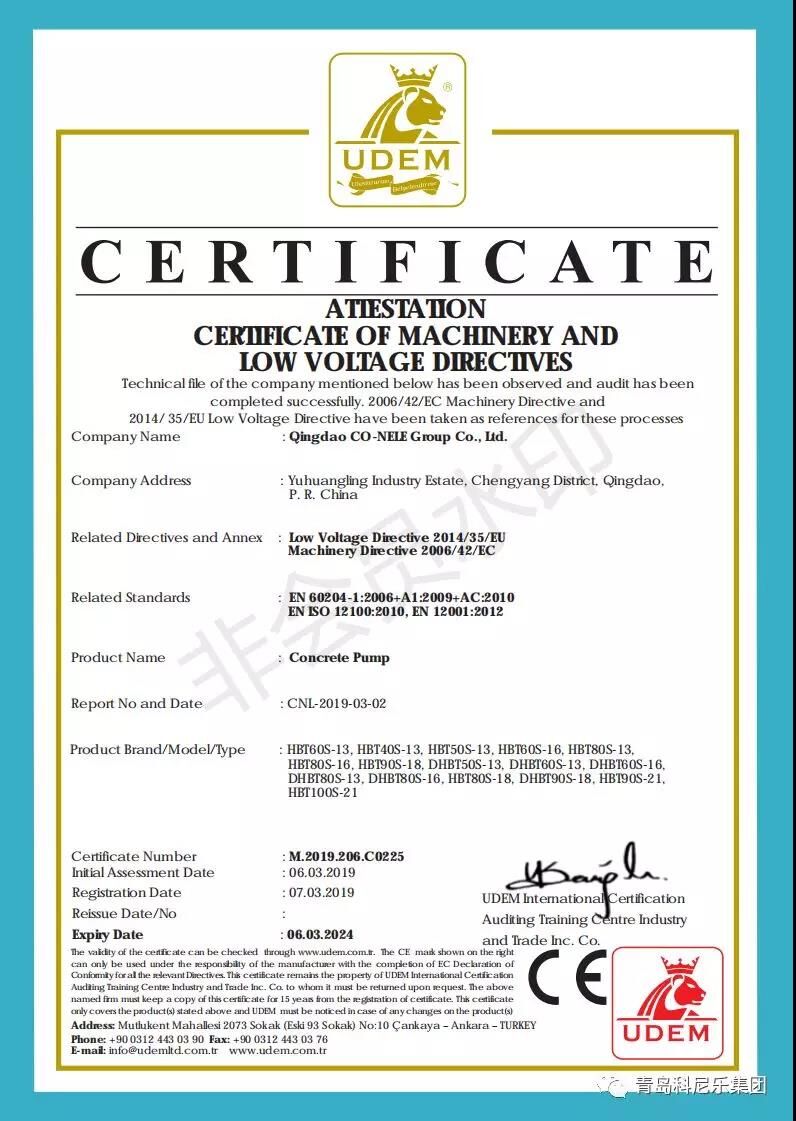 陽春三月,微風習習,科尼樂集團的明星產品混凝土泵、混凝土布料機順利通過了歐盟CE認證,這也代表著科尼樂集團在提升產品品質、拓展銷路、提升企業競爭力方面邁入了新臺階。