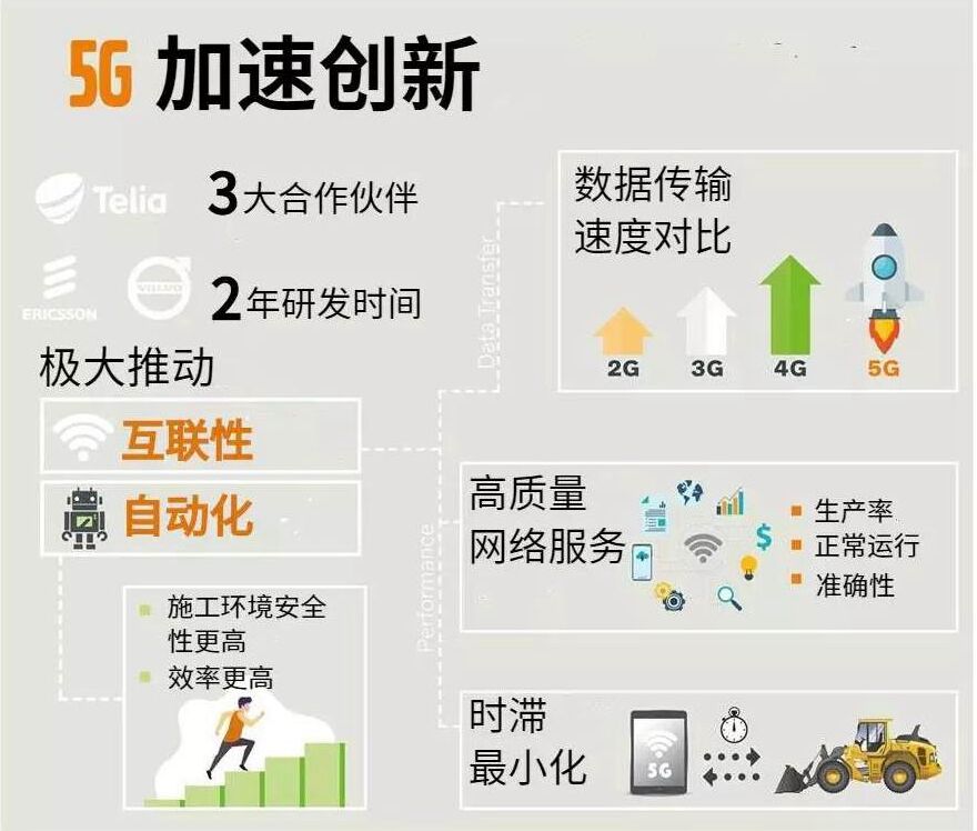 2019年3月,沃爾沃建筑設(shè)備攜手瑞典電信運(yùn)營商特利亞(Telia)和愛立信啟動了瑞典首個工業(yè)5G網(wǎng)絡(luò),將用于遠(yuǎn)程控制輪式裝載機(jī)測試。憑借極短的響應(yīng)時間、大容量、高度的移動網(wǎng)絡(luò)可接入性,5G技術(shù)能為提高效率、降低成本和降低環(huán)境風(fēng)險。