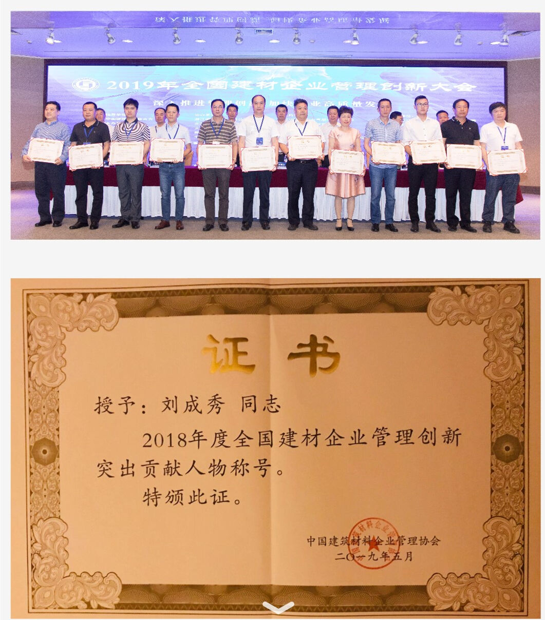 為深入學習貫徹習近平新時代中國特色社會主義思想和 黨的十九大精神,落實《中共中央、國務院關于營造企業家健康成長環境弘揚優秀企業家精神更好發揮企業家作用的意見》 (中發〔2017〕25 號),深入實施工業和信息化部等 11 部委 聯合下發的《關于引導企業創新管理提質增效的指導意見》(工信部聯產業〔2016〕245 號),進一步推動建材企業高質量發展,促進企業轉型升級和提質增效,中國建筑材料企業管理協會于 2018 年 12 月~2019 年 4 月開展了“2018 年度全國建材 企業管理現代化創新成果和管理創新突出貢獻人物”審定活動,歷時五個月,經初審、終審,評選出百位全國建材行業優秀企業家,其中中國工程機械協會混凝土機械分會成員—— 成都金瑞建工機械有限公司劉成秀董事長獲得“2018 年度全國建材企業管理創新突出貢獻人物”稱號!