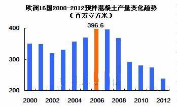 根據(jù)相關(guān)數(shù)據(jù)統(tǒng)計,2006年歐盟預(yù)拌混凝土年產(chǎn)量3.96億立方米,達到近年高峰值,之后產(chǎn)量逐年下降,2012年預(yù)拌混凝土年產(chǎn)量僅2.4億立方米。