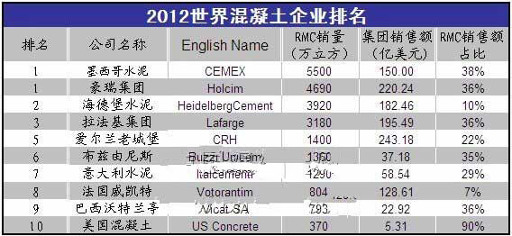 2012中國商品混凝土企業(yè)十強(以實際產(chǎn)量為基準)