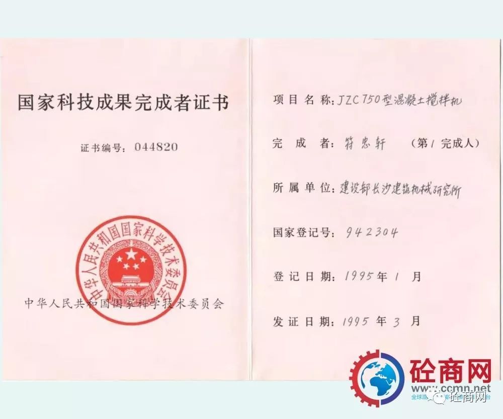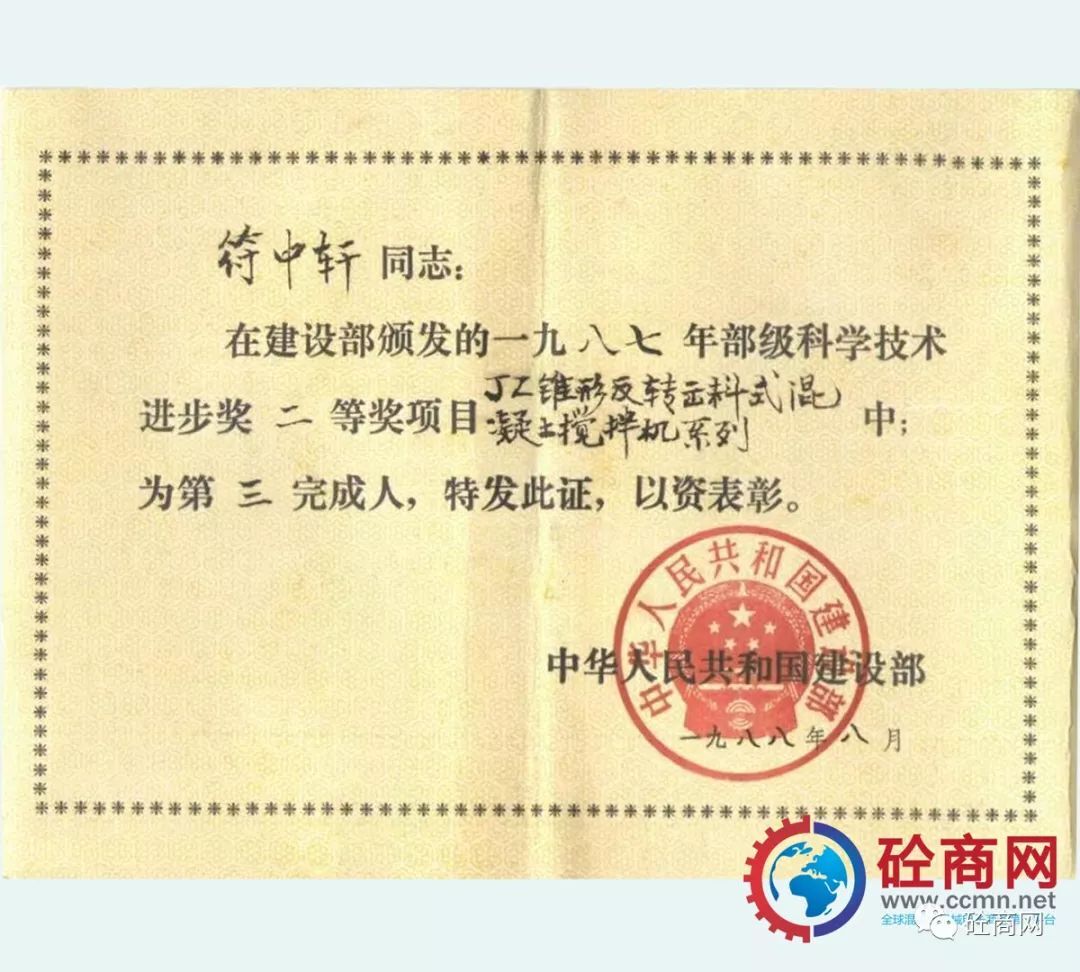 通過全行業(yè)的不懈努力,改革統(tǒng)型機型的結構與技術,新型混凝土攪拌機取得了突飛猛進的發(fā)展,并在全國推廣使用,獲得用戶廣泛的認可與好評。長沙建機院負責的、本人作為主要參與設計者的“JZ錐形反轉出料攪拌機系列”獲建設部1987年科技進步二等獎;代表長沙建機所與方圓集團合作開發(fā)的JZC750混凝土攪拌機,獲得國家科技成果證書。
