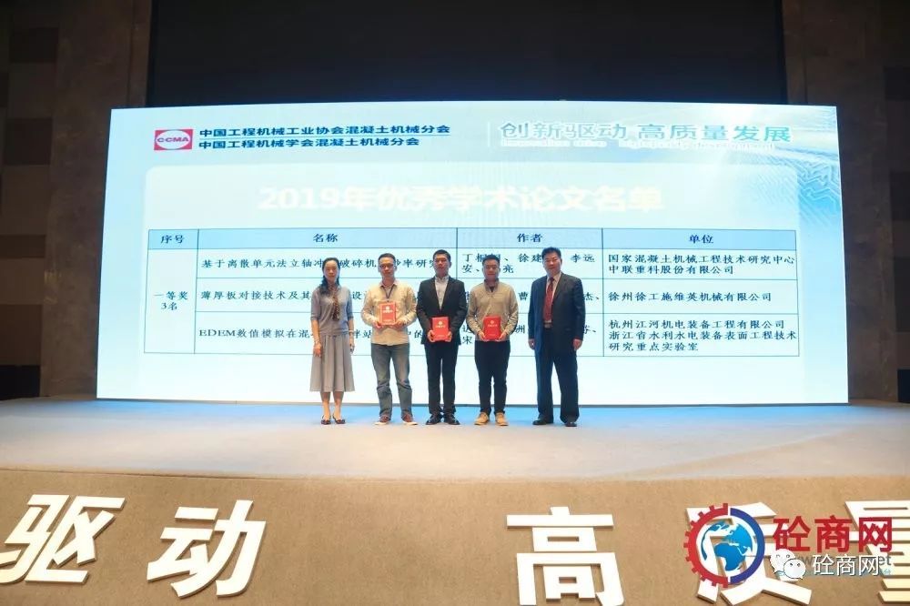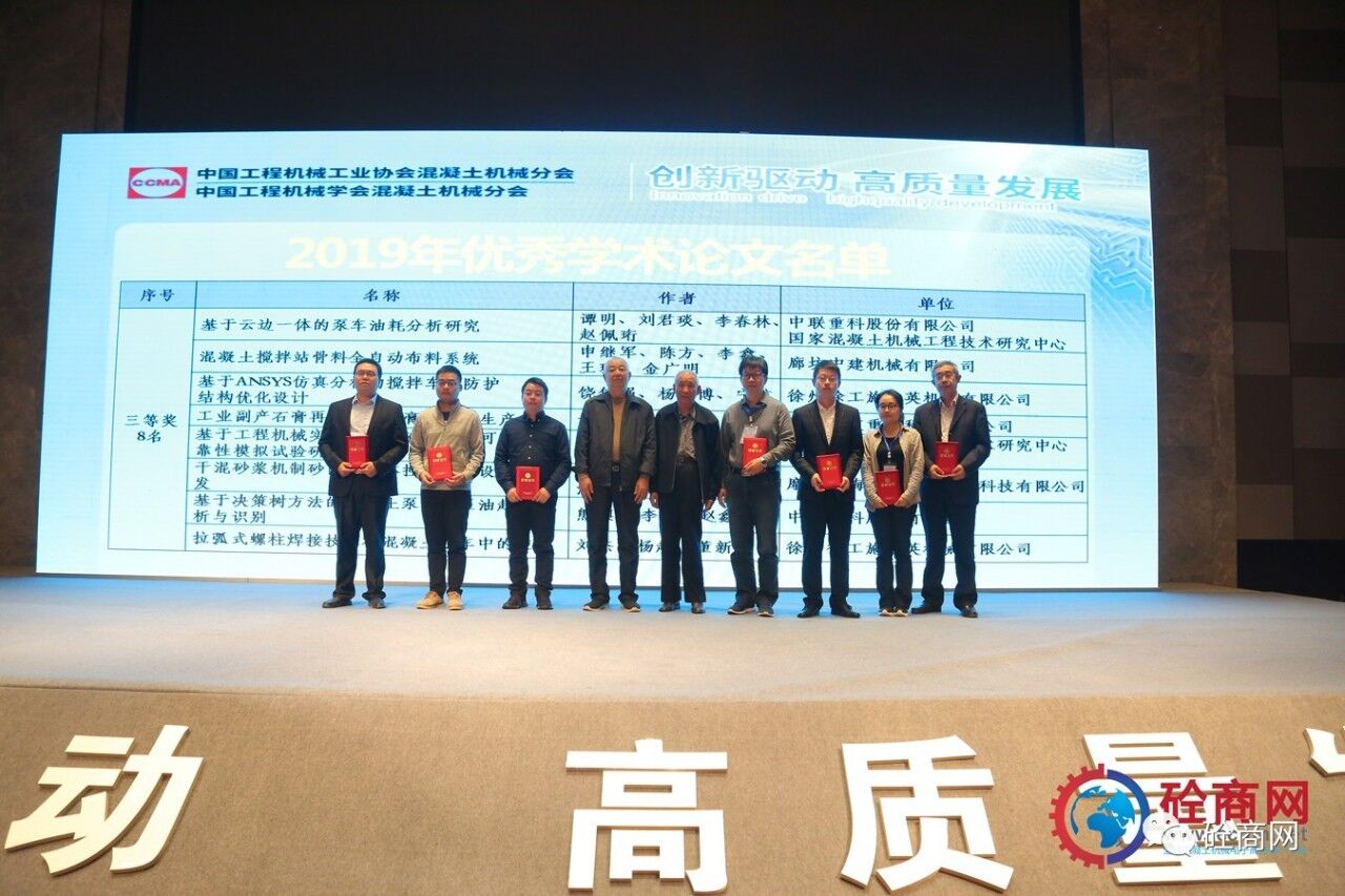 2019年的論文征集評選結果已經揭曉,共收到參評論文26篇,其中會長單位中聯(lián)重科、國家混凝土機械技術研究中心《基于離散單元法立軸沖擊破碎機成砂率研究》等三篇論文獲得一等獎,副會長單位廊坊中建機械有限公司《混凝土攪拌站主機上蓋沾料現(xiàn)象分析與處理方法》共5篇論文獲得二等獎、中聯(lián)重科、國家混凝土機械技術研究中心《基于云邊一體的泵車油耗分析研究》等8篇論文獲得三等獎,其余10篇均獲優(yōu)秀論文獎。在此我提議:讓我們以熱烈掌聲向中聯(lián)重科、徐工施維英、廊坊中建機械有限公司三家優(yōu)秀組織單位和論文獲獎人員表示最熱烈的祝賀和最誠摯的感謝——感謝大家為中國混凝土機械行業(yè)的技術進步所做出的貢獻。