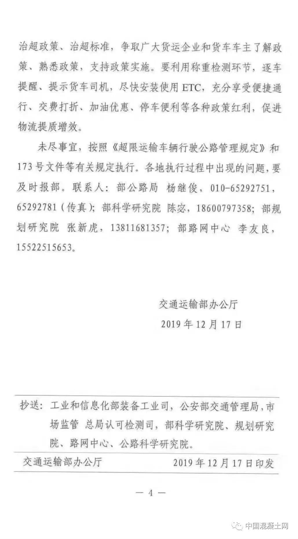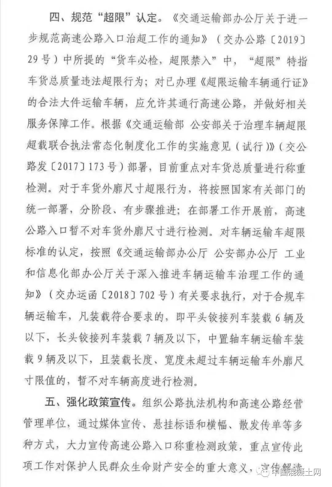 嚴格按照《交通運輸部 公安部關于治理車輛超限超開車聯合執法常態化制度化工作的實施意見 (試行)》(交公路發【2017】173號)規定的《公路貨運車輛超限超載認定標準》執行,嚴禁隨意提高或者降低認定標準。其中,六軸列車驅動形式為6×4的總質量限值為49噸,驅動形式為6×2的總質量限值為46噸。各地不得因驅動形式為6×4人列車未辦理ETC而簡單按照46噸處理,不得簡化宣傳,出現如“貨車最大總質量限定為46噸”宣傳標語,造成公眾誤解。對驅動軸為每軸每則雙輪胎且裝備空氣懸架的3軸、車軸貨車以及4軸鉸接列車總質量限值各增加1噸。考慮到稱重檢測設施(設備)在使用過程中可能出現一定的誤差,對于貨車稱重檢測結果不大于認定標準105%(即超限部分未直如過認定標準的5%)的,暫按未超限超載處理。鑒于兩軸貨車數量多、涉及面廣、情況復雜。目前,部正在商有關部門研究制定專項治理方案。在相關部門統一部署專項治理之前,各地對于車貨總質量不超過18噸的兩軸貨車,不得以超限為由禁止其通行高速公路。同時,要做好相關數據的采集與分析工作,為下一步開展專項治理提供支撐。《交通運輸部辦公室廳關于進一步規范高速公路入口治超工作的通知》(交辦公路【2019】29號)中所提的“貨車必檢,超限禁入”中,“超限”特指車貨總質量違法超限行為;對已辦理《超限運輸車輛通行證》的合法大件運輸致車輛,應允許其通行高速公路,并做好相關服務保障工作。根據《交通運輸部 公安部關于治理車輛超限超載聯合執法常態化制度化工作的實施意見(試行)》(交公路發【2017】173號)部署,目前重點對車貨總質量進行稱重檢測。對于車貨外廓尺寸超限行為,將按照國家有關部門的統一部署,分階段、有步驟推進;在部署工作開展前,高速公路入口暫不對車貨外廓尺寸進行檢測。對車輛運輸超限標準的認定,按照《交通運輸 部辦公室廳 公安部辦公室廳 工業和信息化部辦公室廳關于深入推進車輛運輸車治理工作的通知》(交辦運【2018】702號)有關要求執行,對于合規車輛運輸車,凡裝載符合要求的,即平頭鉸接列車裝載6輛及以下,長頭鉸接列車裝載7輛及以下,中置軸車輛運輸車裝載9輛及以下,且裝載長度、寬度未超過車輛運輸車外廓尺寸限值的,暫不對車輛高度進行檢測。組織公路執法機構和高速公路經營管理單位,通過媒體宣傳、懸掛標語和橫幅、散發傳單等多種方式,大力宣傳高速公路入口稱重檢測政策,重點宣傳此項工作對保護 人民群眾生命財產安全的重大意義 ,宣傳解讀治超政策、治超標準,爭取廣大貨運企業和貨車車主了解政策、熟悉政策,支持政策實施。要利用稱重檢測環節,逐車提醒、提示貨車司機,盡快安裝ETC,充分享受便捷通行、交費打折、加油優惠、車便利等各種政策紅利,促進物流提質增效。未盡事宜,按照《超限運輸車輛行駛公路管理規定》和173號文件等有關規定執行。各地執行過程中出現的要及時報部。全國物流標準非常混亂,地方標準與國家標準經常“打架”,導致全國物流司機苦不堪言,而此次交通廳像各省運輸廳發布特急文件通知,劍指就是統一運輸車輛載重的標準,令運輸行業向制度化,規范化過渡。同時從根源上徹底清除“亂收費”現象,并發布問題反映電話: