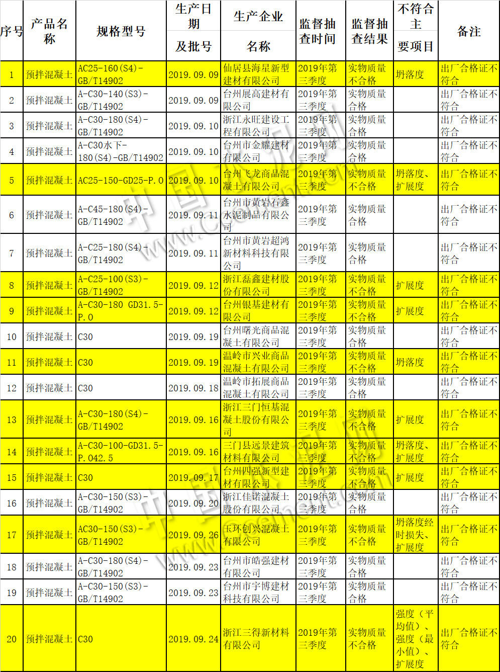 12月24日,臺州市市場監(jiān)督管理局官網(wǎng)發(fā)布2019年預(yù)拌混凝土產(chǎn)品質(zhì)量專項(xiàng)監(jiān)督抽查結(jié)果信息。近期,根據(jù)《中華人民共和國產(chǎn)品質(zhì)量法》、《浙江省產(chǎn)品質(zhì)量監(jiān)督條例》的規(guī)定,臺州市市場監(jiān)督管理局組織開展了2019年臺州市預(yù)拌混凝土產(chǎn)品質(zhì)量專項(xiàng)監(jiān)督抽查,涉及到臺州市有20家企業(yè)的20批次產(chǎn)品,其中實(shí)物質(zhì)量不合格10批次,實(shí)物質(zhì)量不合格率為50%。主要不符合項(xiàng)目為:強(qiáng)度、坍落度、坍落度經(jīng)時損失、擴(kuò)展度。本次專項(xiàng)監(jiān)督抽查發(fā)現(xiàn)合格證普遍存在不符合現(xiàn)象。