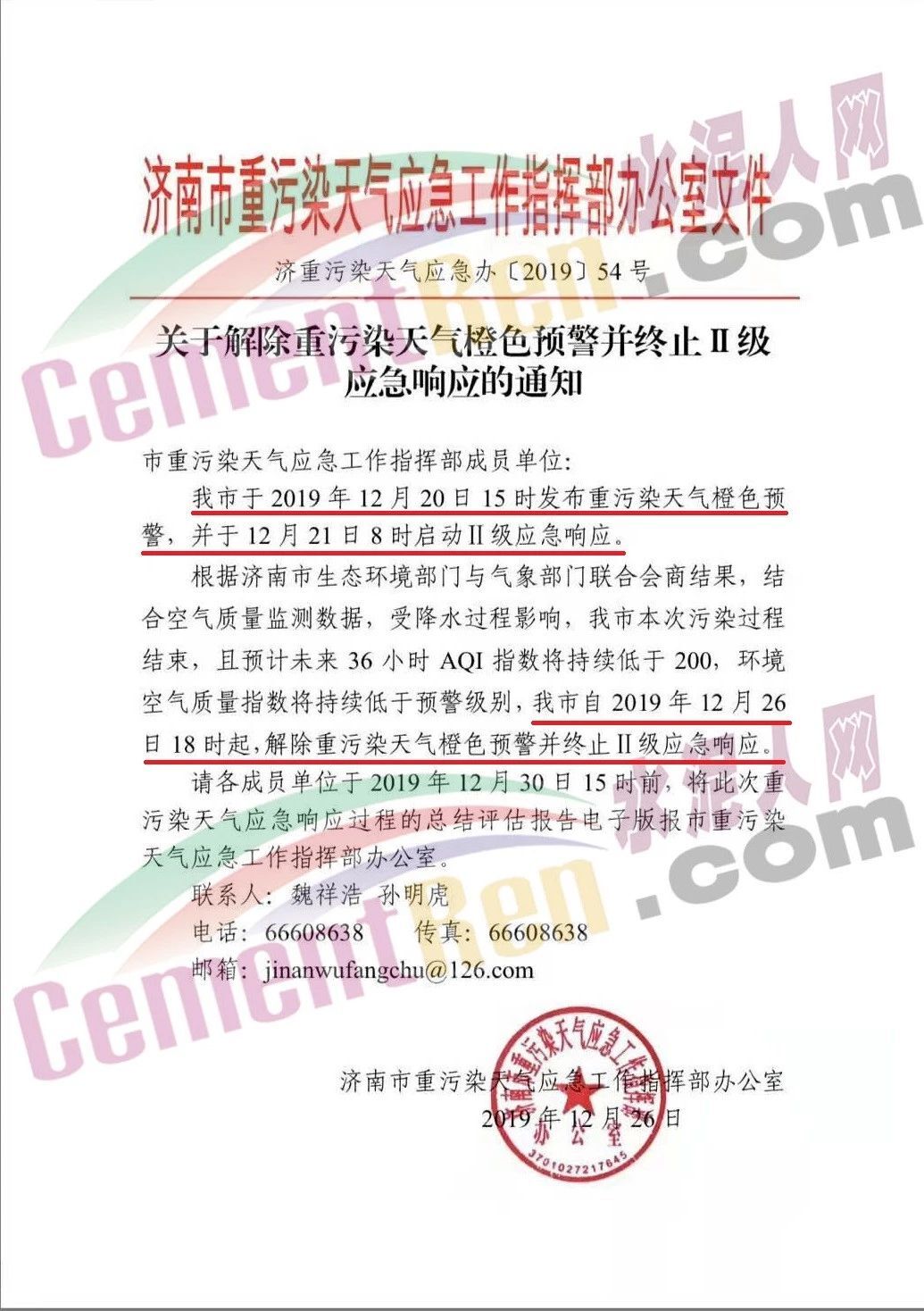 同期,山東省濟(jì)南市重污染天氣應(yīng)急工作指揮部辦公室發(fā)布了《關(guān)于解除重污染天氣橙色預(yù)警并終止II級應(yīng)急響應(yīng)的通知》稱,自2019年12月26日18時起,解除重污染天氣橙色預(yù)警并終止II級應(yīng)急響應(yīng)。通知原文如下: