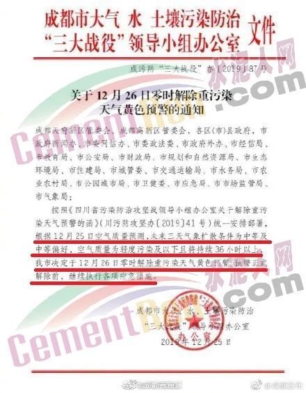 12月25日,四川省成都市大氣水土壤污染防治三大戰(zhàn)役領(lǐng)導(dǎo)小組辦公室發(fā)布了《關(guān)于12月26日零時解除重污染天氣黃色預(yù)警的通知》稱,成都市定于12月26日零時解除重污染天氣黃色預(yù)警,預(yù)警正式解除前,繼續(xù)執(zhí)行各項應(yīng)急措施。通知原文如下: