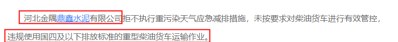 此外,今年10月河北金隅鼎鑫水泥有限公司拒不執(zhí)行重污染天氣應(yīng)急減排措施,未按要求對(duì)柴油貨車(chē)進(jìn)行有效管控,違規(guī)使用國(guó)四及以下排放標(biāo)準(zhǔn)的重型柴油貨車(chē)運(yùn)輸作業(yè),被當(dāng)?shù)丨h(huán)保部門(mén)通報(bào)。