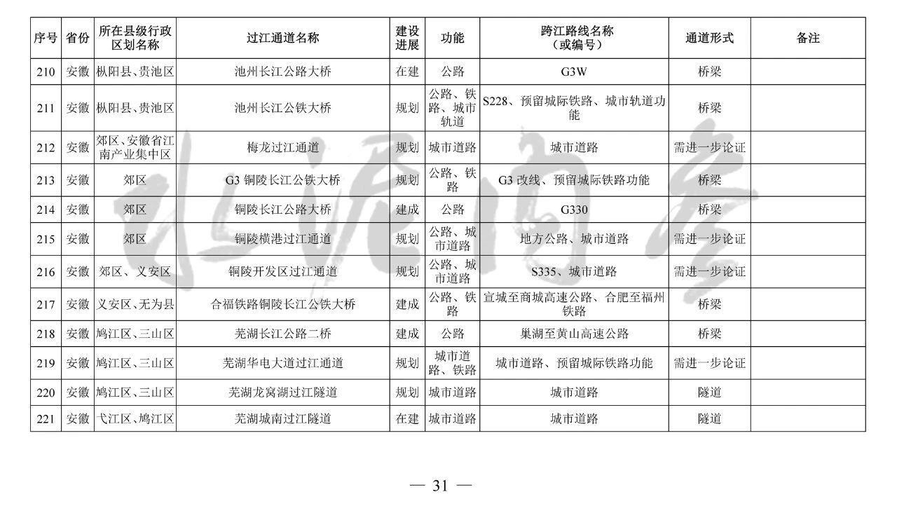 安徽省(9座):望江長江公鐵大橋、安慶海口長江公路大橋、池州長江公鐵大橋、G3銅陵長江公鐵大橋、銅陵開發區過江通道、蕪湖北京路過江隧道、蕪湖泰山路長江公鐵大橋、馬鞍山長江公鐵大橋、馬鞍山九華路過江通道