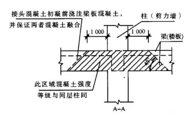 5、節點處的混凝土實行“先高后低”的澆搗原則,即先澆高強度等級混凝土,后澆低強度等級混凝土,嚴格控制在先澆筑混凝土初凝前繼續澆搗梁板的混凝土,事先做好技術交底和準備工作。