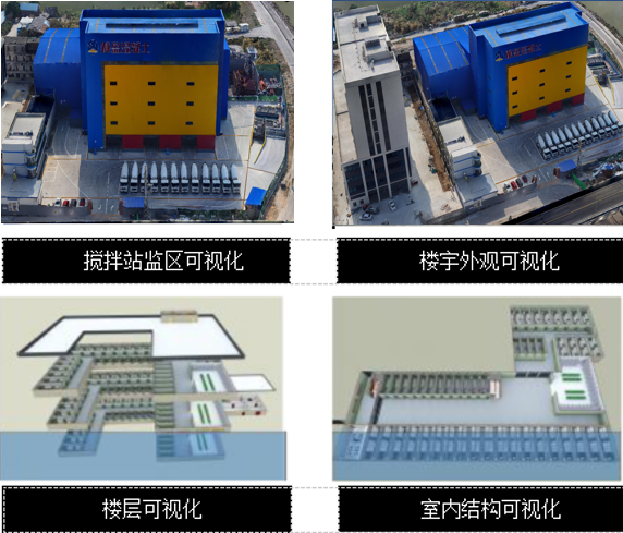 通過3D可視化技術手段,實現攪拌站全場景3D仿真可視瀏覽。場景構建包括攪拌站監區場景、樓宇外觀、樓層、室內結構、特定設備內部等各層級場景的可視化。