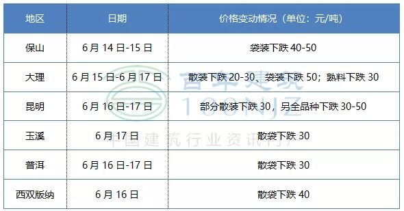 17日云南玉溪、大理地區部分品牌水泥價格下跌30元/噸,雨水天氣市場需求不佳,價格回落。