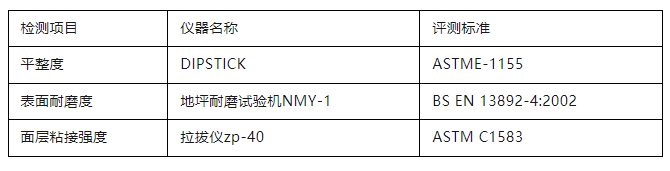 參評項目包括混凝土面層地坪、水泥砂漿面層地坪、整體樹脂地坪系統三大類(下分13種細分地坪)。“WOCA 地坪獎-亞洲賽區”(WOCA AWARDS)執行國際先進的檢測檢驗標準,對候選項目進行現場性能檢測,依據三個維度——平整度(FF/FL Testing)、表面耐磨度(BCA Abrasion Testing)、面層粘接強度(Pull-off Adhesion Testing)的測評數值加權系數后得出最終分數進行評選。