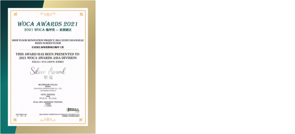 WOCA 地坪獎-亞洲賽區(WOCA AWARDS)由WOCA 亞洲混凝土世界博覽會頒發,旨在表彰亞洲地區整體地坪工程質量優異的地坪項目施工商,并促進亞洲地區整體地坪工程質量的卓越進步。