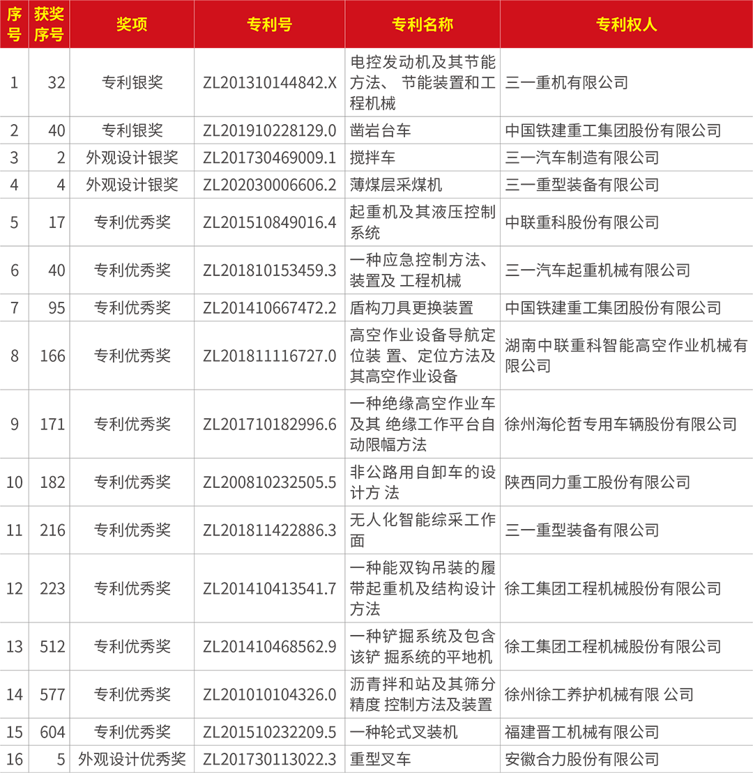 本屆評選活動中,中國工程機械行業共有十六項專利榮獲“中國專利獎”,其中兩項獲專利銀獎,兩項獲外觀設計銀獎,十一項獲專利優秀獎,一項獲外觀設計優秀獎。
