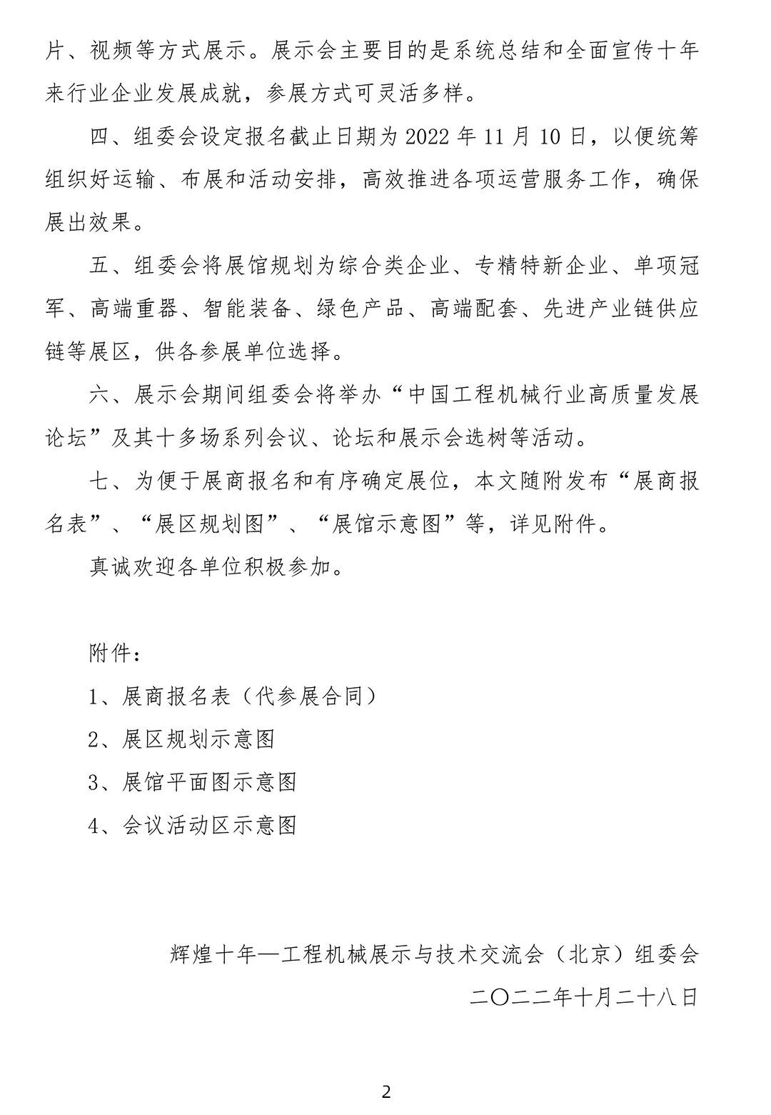 自協會發布舉辦“輝煌十年——工程機械展示與技術交流會(北京)”(以下簡稱“展示會”)通知后,得到了各參展單位的快速響應和積極支持,有的已經報名大面積參展,有的正在履行審批程序或來電表示參加展出,組委會深表衷心感謝!為及時傳遞展會信息,服務好廣大展商,辦好本次展示會,現向廣大展商正式發出邀請,并將有關展示會方案說明如下:一、為充分展示黨的十八大以來工程機械行業各領域取得的發展成就,協會研究決定召開本次展示會,邀請廣大協會會員和產業鏈上下游企業參展,共同分享企業發展成就和謀劃行業美好未來。二、展示會于2022年12月1日至3日在北京冬奧會滑雪大跳臺項目舉辦地——北京首鋼會展中心舉辦。屆時協會將邀請政府部門、相關用戶、媒體朋友和廣大觀眾到展示會現場參觀交流。12月3日(周六)實施社會公眾開放日,讓社會觀眾充分體驗工程機械發展魅力。三、北京首鋼會展中心適合舉辦室內高品質展示會,室外面積有限,而且適合承重較輕的產品展出。組委會初步規劃總展出面積2萬平米左右,希望各參展企業提供產業鏈上下游的先進技術產品和高端裝備進行展出,大型設備和示范工程應用等可通過模型、圖片、視頻等方式展示。展示會主要目的是系統總結和全面宣傳十年來行業企業發展成就,參展方式可靈活多樣。四、組委會設定報名截止日期為2022年11月10日,以便統籌組織好運輸、布展和活動安排,高效推進各項運營服務工作,確保展出效果。五、組委會將展館規劃為綜合類企業、專精特新企業、單項冠軍、高端重器、智能裝備、綠色產品、高端配套、先進產業鏈供應鏈等展區,供各參展單位選擇。六、展示會期間組委會將舉辦“中國工程機械行業高質量發展論壇”及其十多場系列會議、論壇和展示會選樹等活動。七、為便于展商報名和有序確定展位,本文隨附發布“展商報名表”、“展區規劃圖”、“展館示意圖”等,詳見附件。