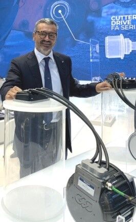 首席執行官Fausto Carboni在慕尼黑舉行的2022Bauma展上展示用于建筑機械的新型電力驅動裝置。