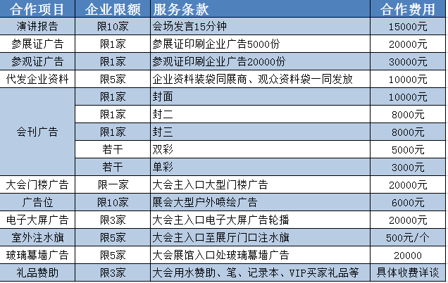 八、合作方式:我們誠摯邀請并期待您的參與,合作方式包括但不僅限于:企業演講、參展證廣告、參觀證廣告、會刊廣告、戶外廣告位、注水旗、電子大屏、玻璃幕墻廣告、大會門樓廣告、禮品贊助、晚宴贊助等