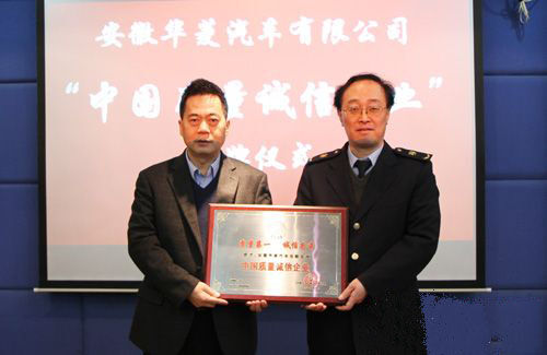 摘要:近日,受中國(guó)檢驗(yàn)檢疫協(xié)會(huì)委托,安徽檢驗(yàn)檢疫協(xié)會(huì)專程來(lái)到華菱星馬,向安徽華菱汽車有限公司頒發(fā)“中國(guó)質(zhì)量誠(chéng)信企業(yè)”牌匾。