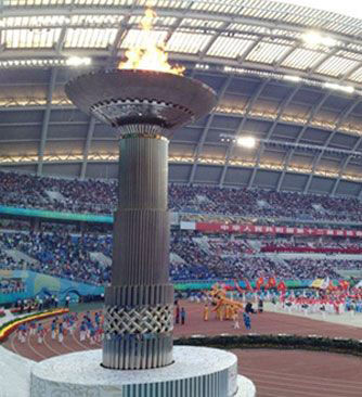 主火炬由沈陽北方交通重工集團負責創意、設計、制作、安裝及點火的工作。據悉,本次主火炬的制作工作時間緊急,任務繁重。在僅50天的時間里,北方交通主火炬制作團隊克服了重要技術及工藝難關,僅用26天時間就成功升起。同時,本次主火炬的制作,創下了歷屆當中時間最短的紀錄,更是首次在室內場館中進行搭建吊裝,并且克服了多節升降結構的舉升難題。作為項目總負責人,沈陽北方交通重工集團董事長、總裁曲凱先生又立下了汗馬功勞,臨危受命之后為此特別成立了工作指揮部,全程親自指揮調度主火炬的創意、制作、安裝和調試工作,不分白天黑夜奔波于工廠和奧體中心之間,并及時向有關領導匯報工作。為保證完成時間,他制訂了嚴格的計劃表,要求各部門積極配合,同時調動所有可以調動的資源,克服一切困難全力奮戰,保證晝夜連續施工,主火炬牽涉部件近萬個,涉及電器、傳感、液壓、機械控制等多個領域,在北方交通近500人制作團隊的齊心協力下,艱苦奮戰了40多個晝夜,主火炬終于如期完成,以最完美的姿態呈現在世人面前。