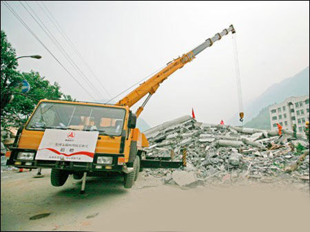 5月14日起,三一7臺挖掘機、8臺起重機以及80多名具有設備操作經驗的青年員工組成抗震救災志愿者突出隊,受命開赴災區。