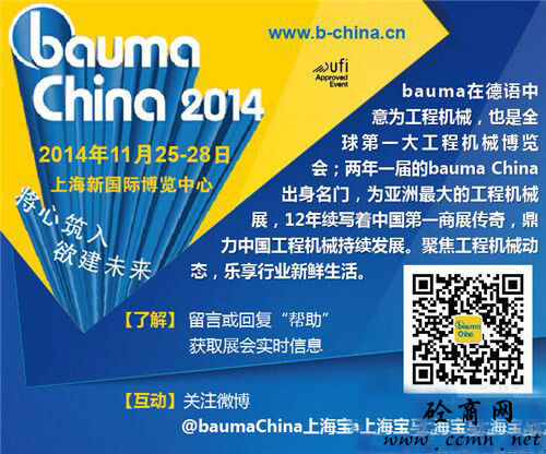 China 2014,11月25-28日行業(yè)翹楚絢麗登陸上海新國際博覽中心,工程機(jī)械行業(yè)產(chǎn)品全面細(xì)分展示。看風(fēng)云變幻,捕行業(yè)動向,我們相約bauma China 2014!
