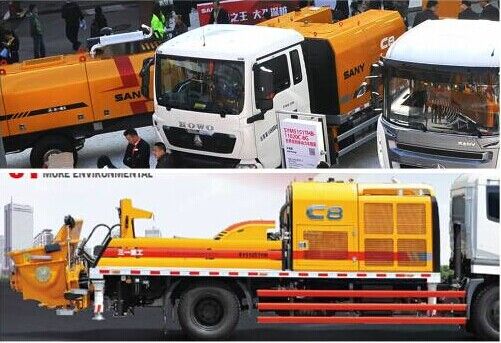 三一HOWO國Ⅳ排放標(biāo)準(zhǔn)單動力車載泵(無上裝動力)是bauma展覽會上展出的唯一一臺車載泵。配置單一動力和進(jìn)口分動箱,從而節(jié)約了一臺上裝泵送柴油發(fā)動機(jī),是該車的最大亮點(diǎn)。該車載泵柴油機(jī)功率為206kW,6.87L排量,配置400L大油箱,混凝土理論輸送壓力10/20MPa,理論輸送量115/60m3/h。