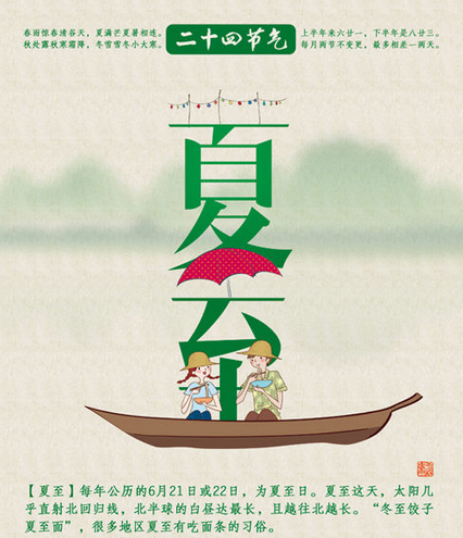 夏至是二十四節氣中最早被確定的一個節氣。公元前七世紀,先人采用土圭測日影,就確定了夏至。每年的夏至從6月21日(或22日)開始,至7月7日(或8日)結束。據《恪遵憲度抄本》:“日北至,日長之至,日影短至,故曰夏至。至者,極也。”夏至這天,太陽直射地面的位置到達一年的最北端,幾乎直射北回歸線(北緯23°26\'),北半球的白晝達最長,且越往北晝越長。如海南的海口市這天的日長約13小時多一點,杭州市為14小時,北京約15小時,而黑龍江的漠河則可達17小時以上。夏至以后,太陽直射地面的位置逐漸南移,北半球的白晝日漸縮短。民間有“吃過夏至面,一天短一線”的說法。而此時南半球正值隆冬。