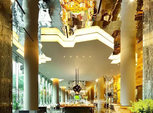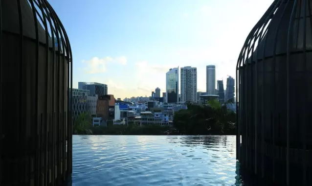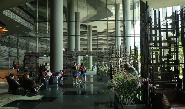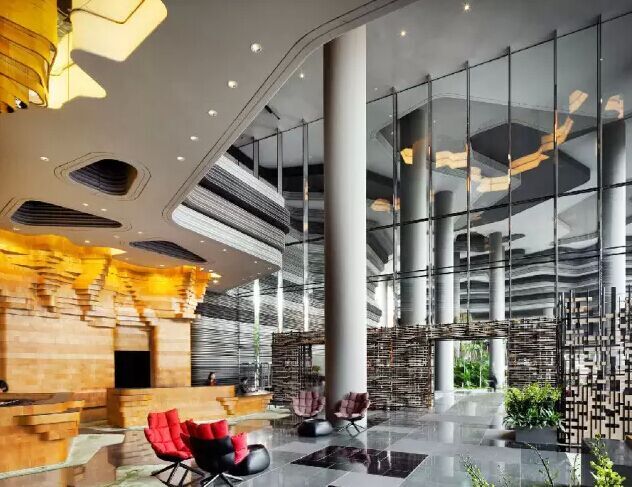 建筑流動的幾何體給人一種高聳入云之感,塔樓每隔三層客房擁有懸挑的空中花園,上面種滿了熱帶植物,它已成為城市綠地的一部分,與鄰近公園融為一體。酒店擁有自我遮陽功能,懸挑而出的空中花園和相鄰的三座酒店客房大樓都能起到遮陽的作用,客房樓層立面采用低輻射玻璃。酒店頂樓的屋頂花園可將全城風光一覽無余,獨家蘭花貴賓會所位處該層,并配有私人會議空間、圖書館和專用的貴賓會所門房。酒店五層設有可俯瞰城市的無邊界泳池,設備先進的健身中心,特色的鳥籠休息涼亭及長達300米花園走道。