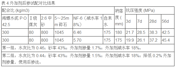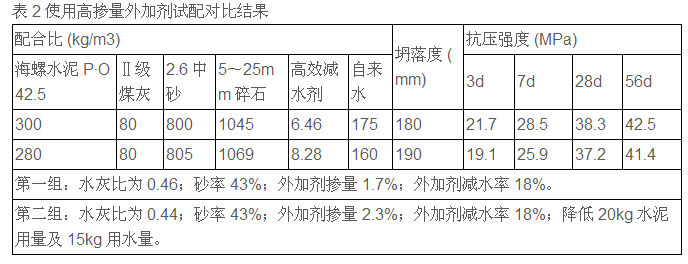 試配對比結果分析:其他材料相同,使用高效減水劑(NF-1),保持砂率及外加劑摻量不變,適當降低水泥用量及用水量,使水灰比降低,在相同的坍落度下28d 及 56d 強度相近并降低了成本。