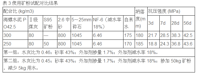 磨細礦粉能延緩膠凝材料的水化速度,延長凝結時間,尤其在炎熱的夏季及大體積混凝土應用中有明顯效果。另外礦粉具有改善混凝土工作性,改善混凝土的內部結構,提高抗滲和抗腐蝕的能力,這些都有大量試驗證明。因為水泥與礦粉存在部分差價,利用礦粉后期增強效果,既可以降低水化熱,減少裂縫的產生,又可以使混凝土后期強度不變或更高。如表3。