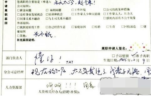 部門負責人回復:“懂你,TAT”;分公司總經理回復:“現在的90后,太不負責任了,我表示無語。同意”;人力資源部回復:“呵呵!!!同意”。