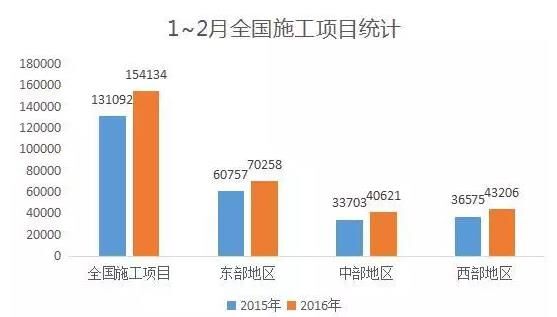 今年1~2月,全國施工項目154134個,比去年同期增加23042個。其中,東部地區施工項目70258個,增加9501個;中部地區施工項目40621個,增加6918個;西部地區施工項目43206個,增加6631個。
