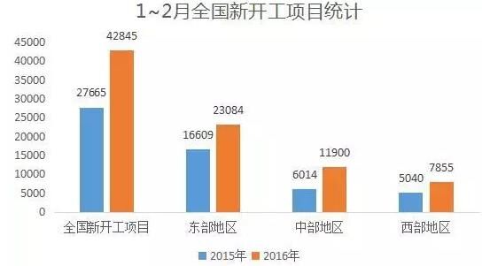 今年1~2月,全國新開工項目42845個,比去年增加15180個。其中,東部地區新開工項目23084個,增加6475個;中部地區新開工項目11900個,增加5886個;西部地區新開工項目7855個,增加2815個。