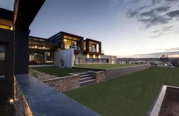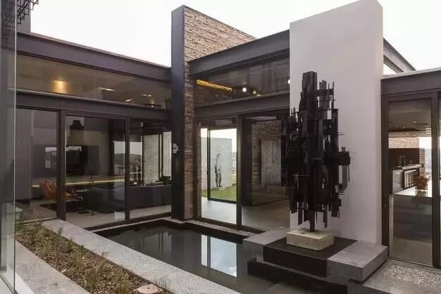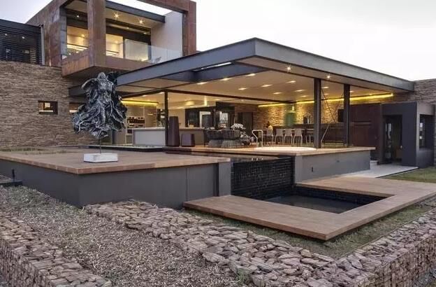 建筑師用鋼鐵,混凝土,玻璃為主要材料,結合就近取材的天然板巖和花崗巖,天然實木地板 ,打造了一個工業時代感的現代化豪宅,貫穿建筑的兩級錯落水景是設計中的主要亮點。