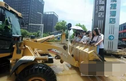 此時洪水涌動,伴隨發動機的轟鳴聲,一抹忙碌的徐工金沖破洪水的包圍來到他們面前,將鏟斗平穩放在地上,似紳士伸出友好之手。大家心領神會,紛紛站進斗里,享受這趟特殊的專車服務。