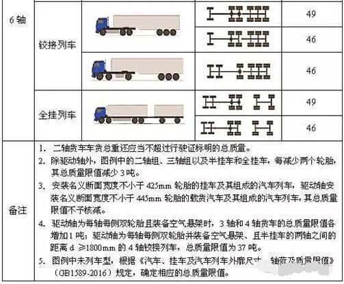 按照《道路車輛外廓尺寸、軸荷及質量限值》確定的最大質量限值作為認定標準。其中,最大的變化是6軸車由55噸變為49噸。