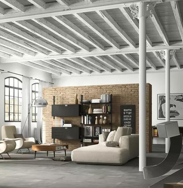 水泥灰的瓷磚,白色吊頂及墻面,營造出一種略微冰涼不近人情的工業(yè)氛圍,空闊粗糙的設計感,組成一個有著極大吸引力的家居風格。